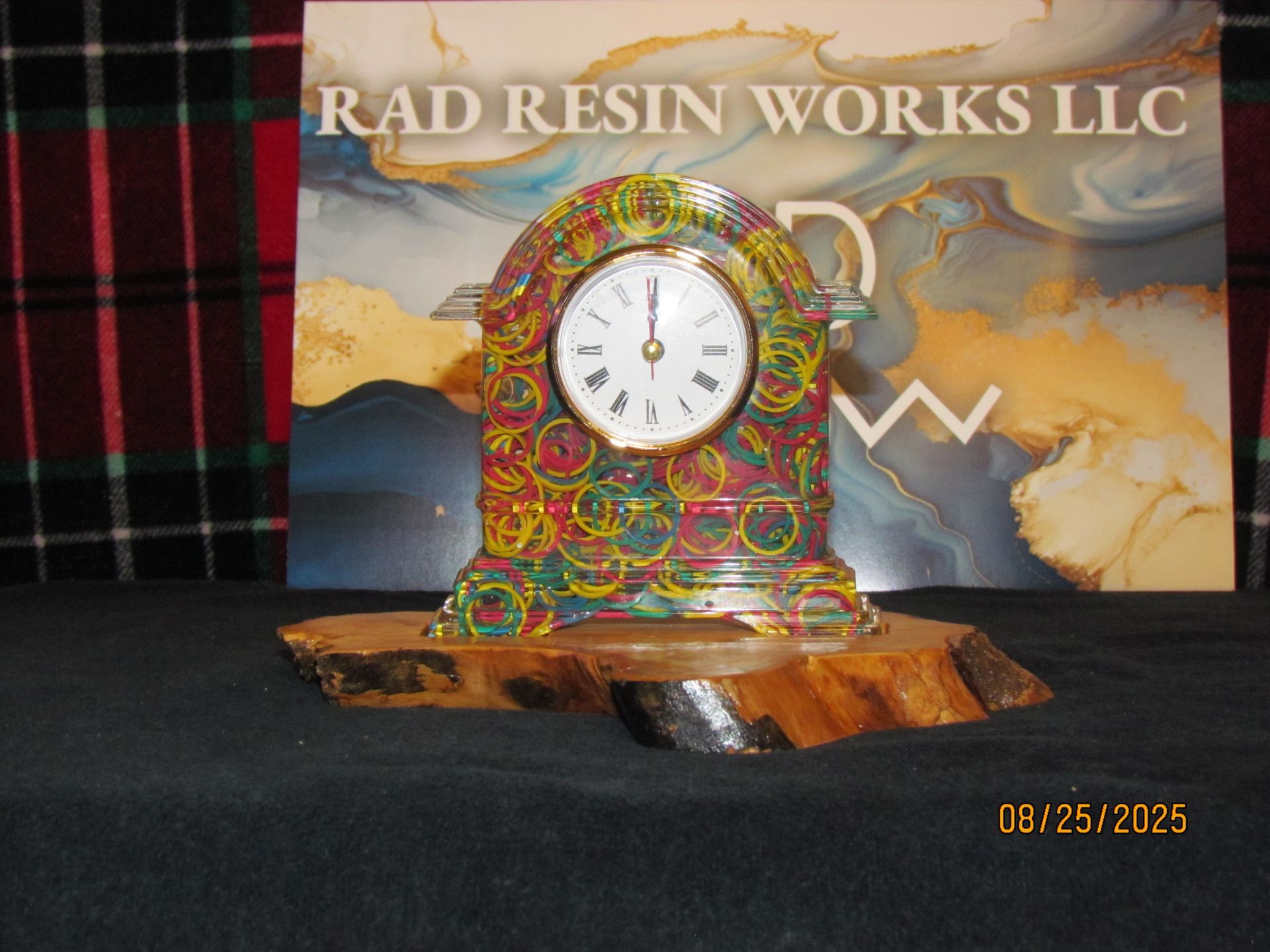 conversation starter to say the least. olive wood base, rubber bands inside the clock, dimensions and weights are with the pieces in their shipping box.